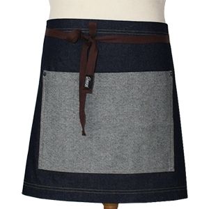 A street-inspired denim waist apron with a contrasting denim pocket.