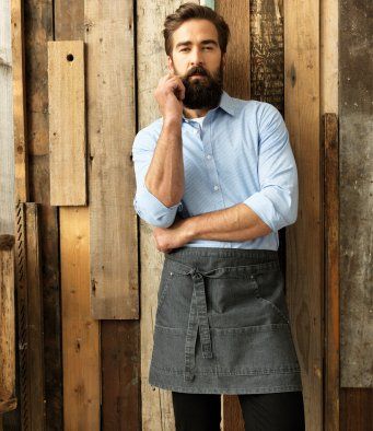 A popular cropped style featuring contrast stitch detail that forms four front pockets which are handy for carrying payment terminals and order pads.  Self-fabric ties are long enough to be doubled and tied at the front completing a neat and professional uniform for service staff.
