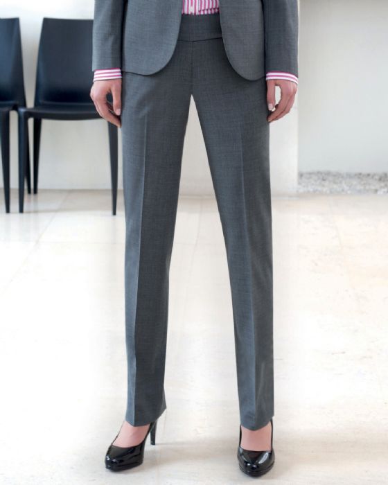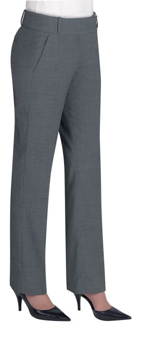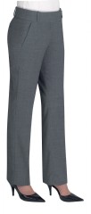 Slim leg ladies' trouser with a front hook fastening, two side pockets, mock rear pockets and belt loops.