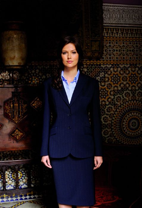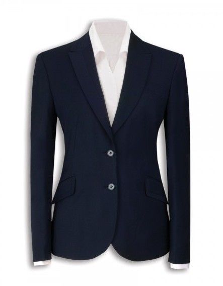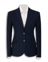 Tailored fit ladies' two button jacket with lapel and pocket contrast detail, a centre vent, tailored back panels and one inside pocket.