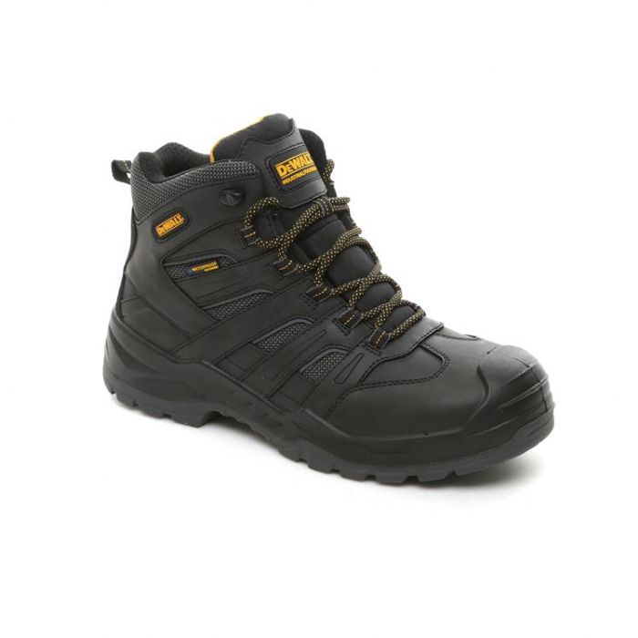 DeWalt Murray is a waterproof, hiker style work boot. Murray has a leather and mesh upper and is manufactured with a waterproof and breathable bootie, steel toe cap and steel midsole protection. The boot has been made with a wider last to give a generous wider fitting. PU comfort insole. Padded tongue and collar for added comfort. The PU/Rubber outsole is certified to the best slip rating, as well as achieveing resistance to fuel oil and the ladder grip status, which is driven from the firefighters certification. PU toe guard gives added protection to the toe area.
