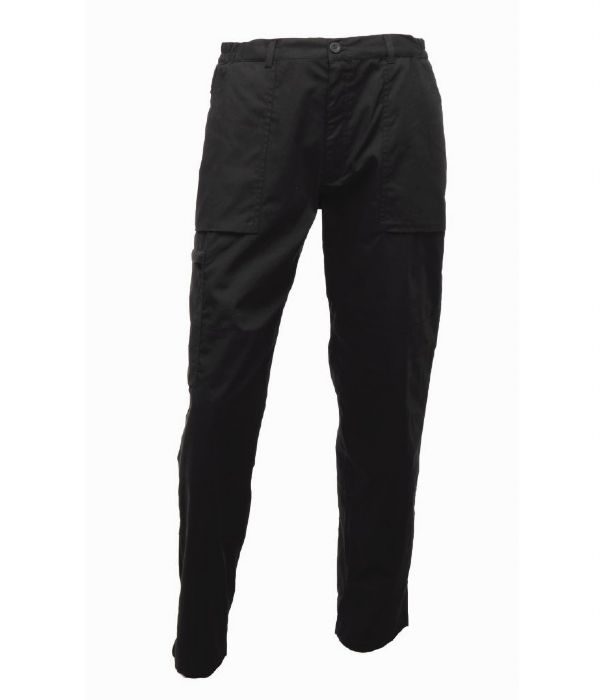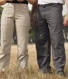Water repellent finish. Part elasticated waist with zip fly and button. Belt loops. Knee patches. Tow large front pockets with hem bellows. Right leg zip pocket. Two back pockets - right with zip.