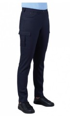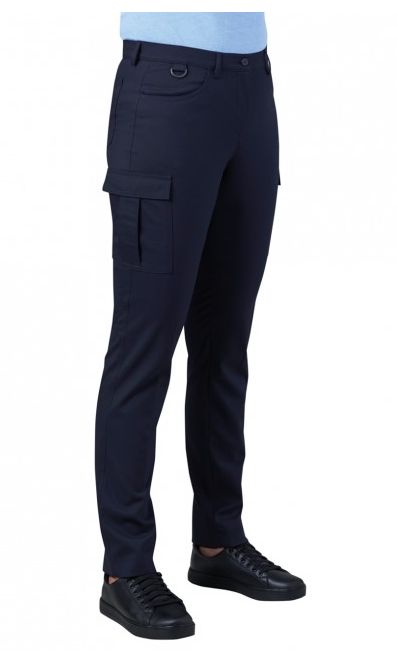 Tailored leg, 2 cargo pockets, 2 hip patch pockets, 2 front pockets, button fastening, metal key loop.