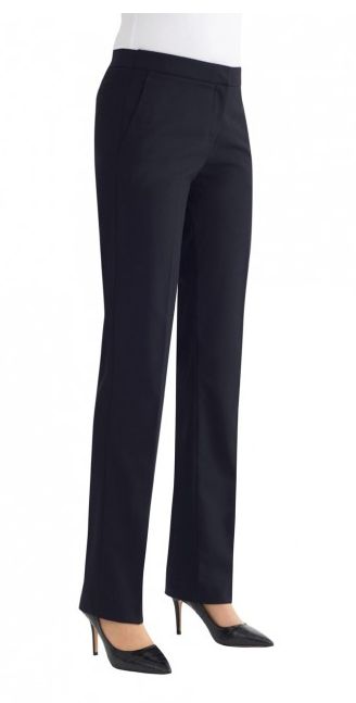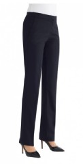 Tailored leg, 2 side pockets, 2 mock hip pockets, fashion feature stretch waistband